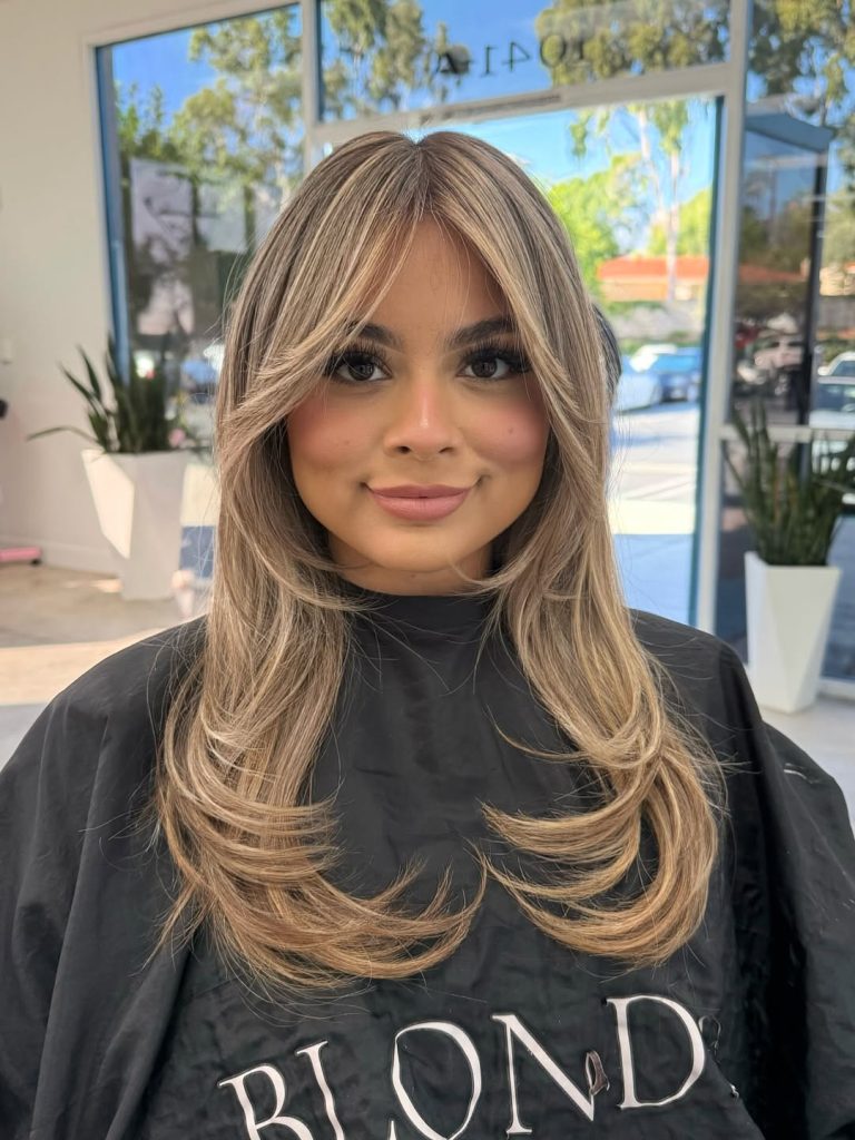 Long layered hair with airy wispy bangs feels effortlessly romantic. The fringe softly parts and blends into the surrounding layers, creating a light, feathered frame around the face. The entire hairstyle moves naturally with every step, giving the hair a relaxed and slightly dreamy vibe. It’s a look that feels feminine without being overly styled—like you simply let your hair fall exactly where it wants.