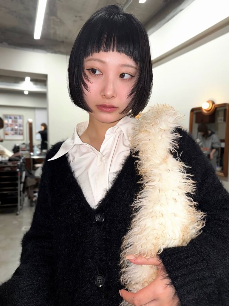 This short bob haircut feels bold and fashion-forward in the best way. The sleek bob curves gently around the jaw, while the short fringe creates a striking contrast that draws attention straight to the eyes. It has a modern, editorial vibe—clean lines, sharp structure, and a little bit of artistic edge.