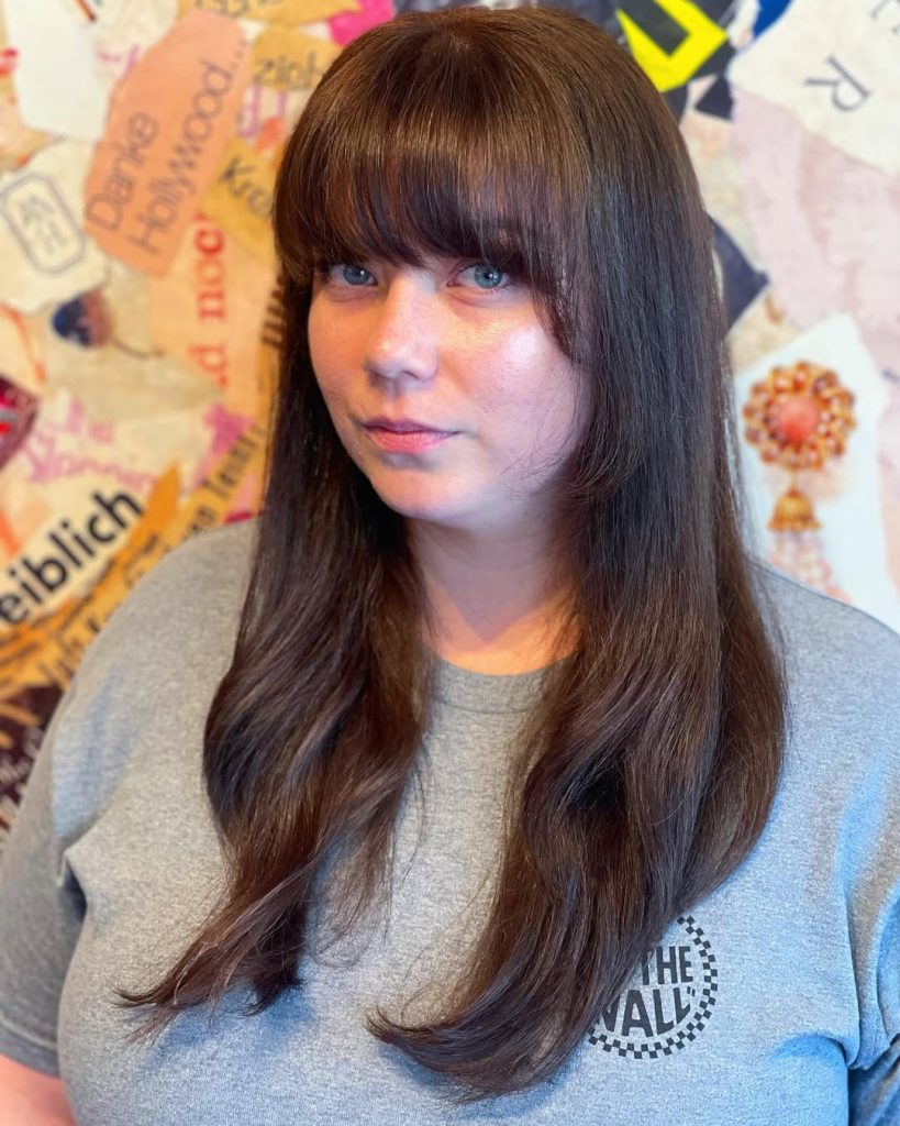 This cut with bangs is one of the Best choices for women with straight hair who want a style that feels timeless. The full fringe softens the forehead, while the long layers help maintain a flatter Shape around a round face. A round brush and lightweight shine serum can keep the bangs smooth and glossy, helping the entire hairstyle look healthy and refined.