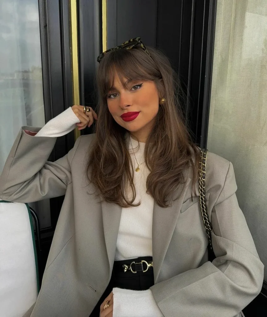 Long layered hair paired with soft curtain bangs always carries that romantic, slightly Parisian vibe. The fringe falls gently to the sides, opening the face, while the flowing layers add movement through the lengths. It’s one of those hairstyles that looks polished with minimal effort and somehow makes every outfit feel a little more stylish.