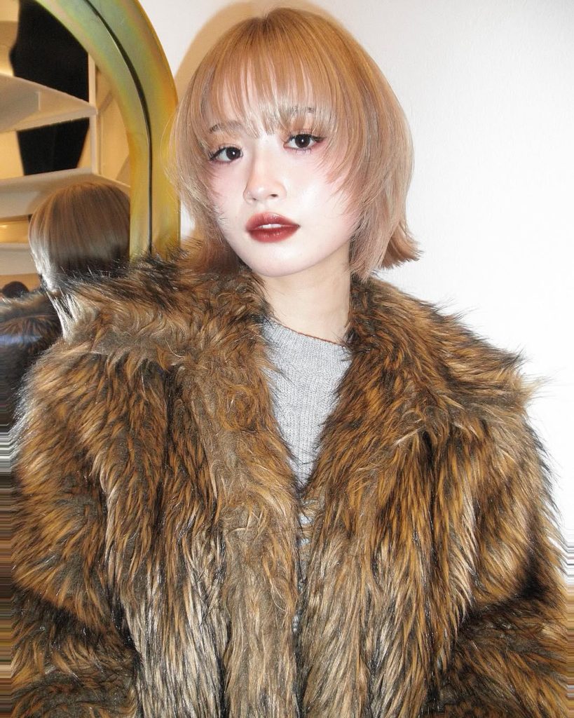 There’s something charming about a softly shaped short bob that instantly makes the whole face glow. The hair curves gently around the cheeks, while the wispy curtain fringe opens slightly in the center, creating that relaxed, effortless balance between playful and polished. It’s the kind of haircut that feels fresh and stylish without trying too hard, like you simply woke up looking this put together.