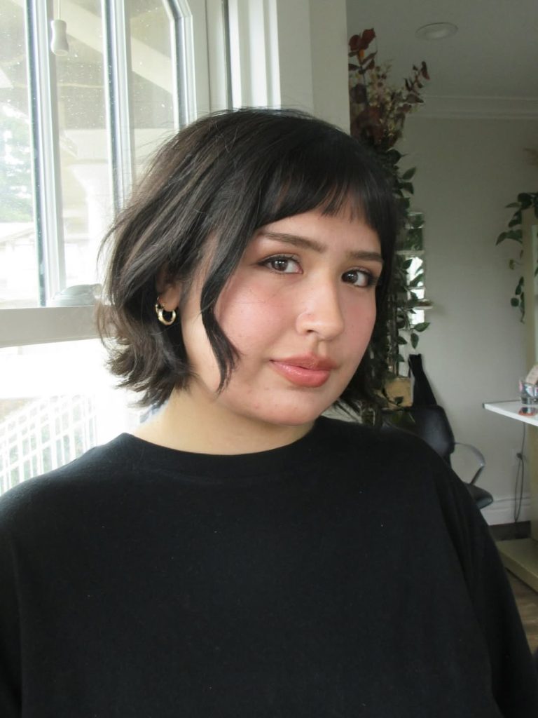 This short bob haircut works beautifully for women who want a flattering Shape without sacrificing their very short hair. The wispy curtain fringe softens the front of the face, while the rounded bob structure adds definition, which balances a round face. It’s especially lovely for straight hair or slightly wavy hair. A quick blow-dry with a round brush gives the ends that soft bend that makes this look feel so modern.