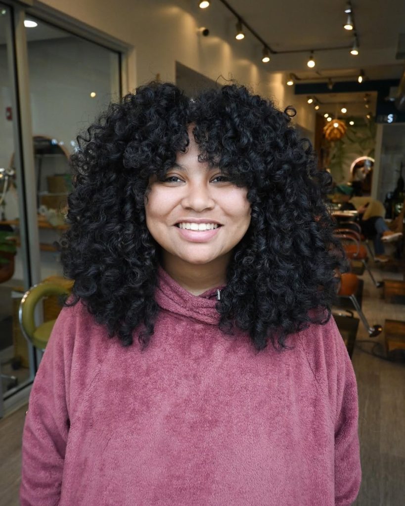 15. Curly Medium-Length Hair with Curly Bangs