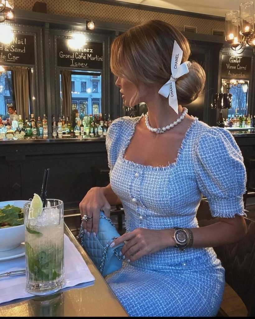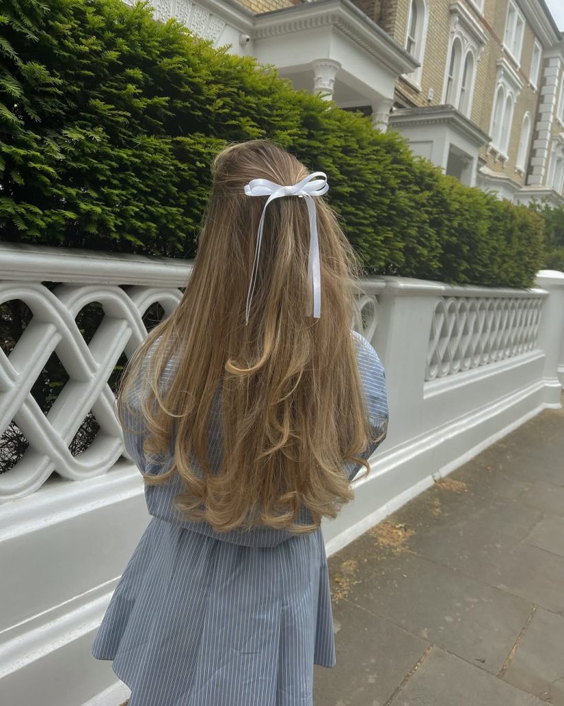 There’s an airy elegance in this half-up, half-down style tied with a white ribbon. The simplicity of the look is what makes it so captivating—it’s soft, natural, and perfectly coquette. For a walk through the city or a Sunday lunch, it gives that “I didn’t try too hard” charm that feels instantly feminine.