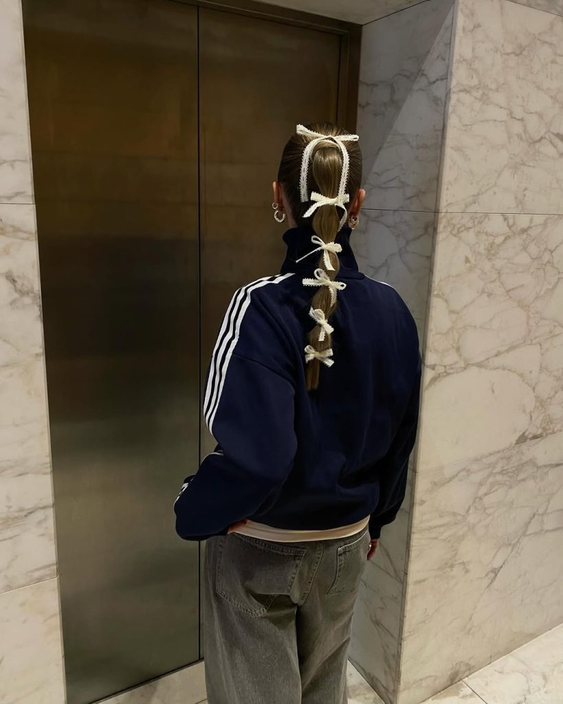 This bubble ponytail wrapped in a series of small white bows takes sporty-chic to a new level. It’s playful yet incredibly polished, turning a basic ponytail into a creative statement piece. The symmetrical ribbons create a sense of rhythm and structure, adding texture without overpowering the overall look.