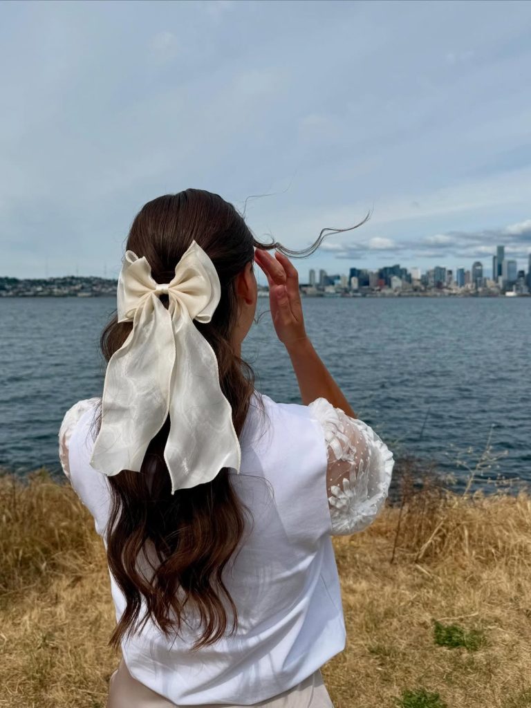 This soft half-up, half-down hairstyle with a flowing cream bow captures the essence of effortless romance. It feels breezy and graceful, like a seaside stroll on a warm afternoon. The delicate ribbon adds movement and charm without overwhelming the look, making it perfect for women who love understated femininity and natural textures.