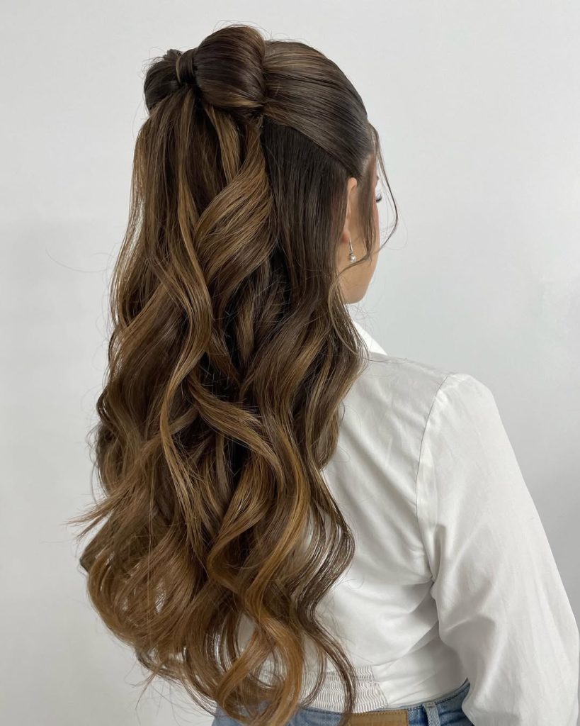 This bow hairstyle for women can be done on long hair with a natural body and curls. A curling wand can be used to create soft waves. The top half is gathered to form the bow. With a shine spray, the look can be finished for added definition. It is easy to wear, and the style can transcend to any outfit and add a gentle charm.