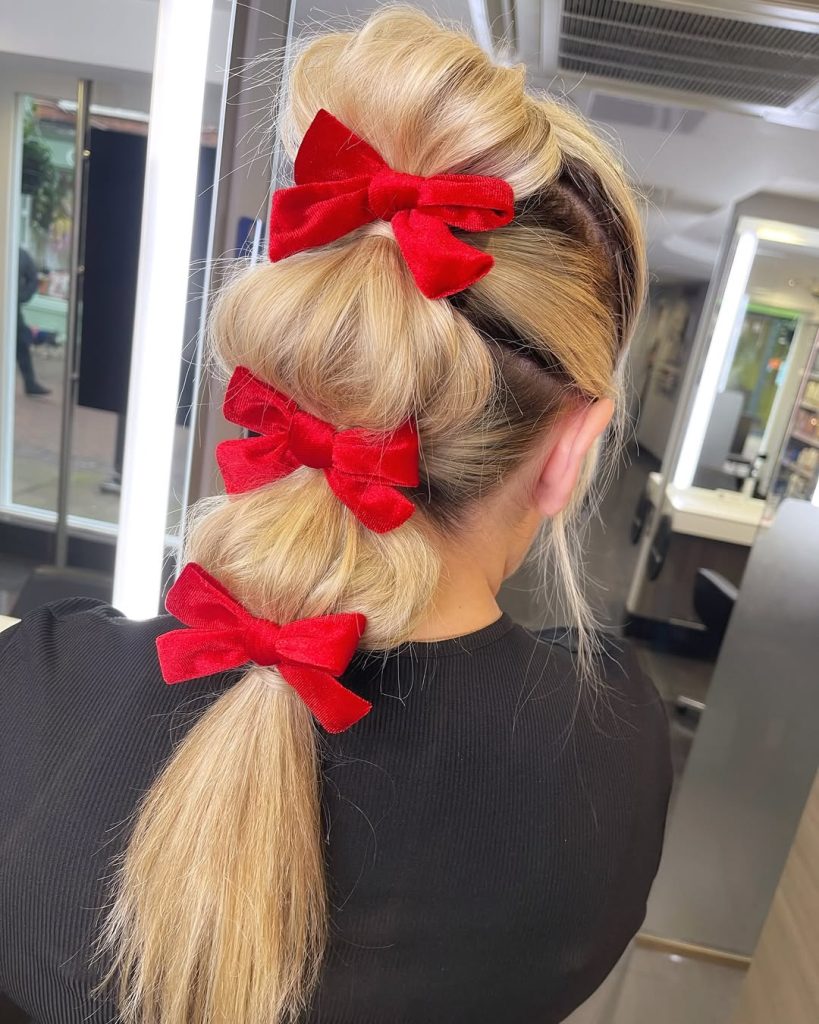 Three red velvet bows in a cascading ponytail bring a fun, festive twist to this elegant hairstyle. It’s playful, confident, and full of personality—the kind of look that turns heads during holidays or parties. The contrast of the vibrant red against blonde hair makes every bow pop beautifully, creating a strong visual statement.