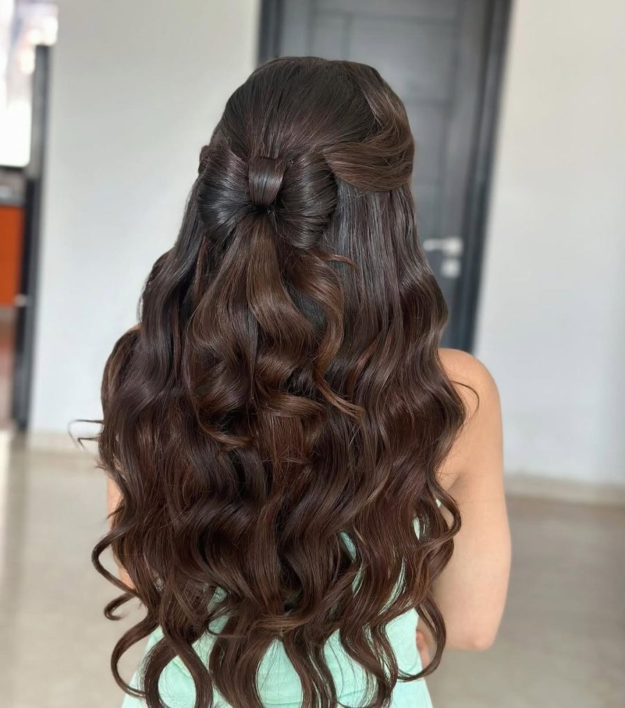 This hairstyle suits long curly hair or thick wavy hair. To recreate it, section the top half and use a curling wand to define the waves, securing the bow gently in the middle. It’s a look that pairs effortlessly with elegant dresses and soft makeup—a showstopper for any event.