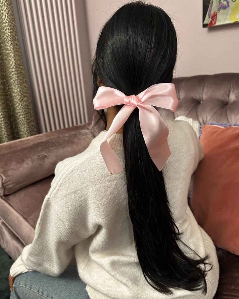 A sleek low ponytail paired with a blush pink bow brings subtle romance to everyday style. It’s minimal yet striking—a look that feels clean, polished, and irresistibly soft. The pastel ribbon adds a touch of coquette sweetness, making this style a go-to for days when you want to look put together with minimal effort.