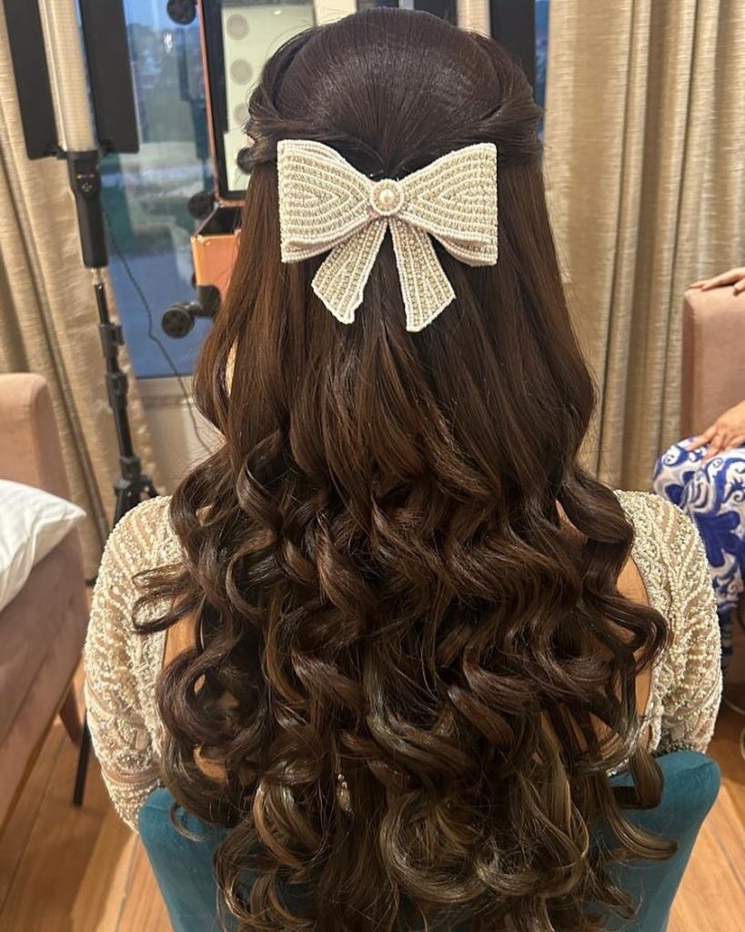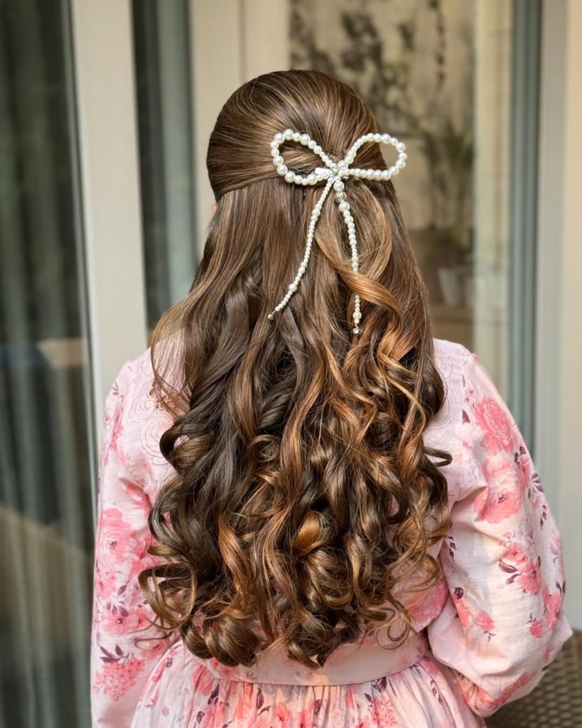 The beaded bow centerpiece makes this hairstyle shine—it’s glamorous without being too formal. The intricate details and soft curls evoke an air of sophistication, ideal for evening events or special celebrations. The pearls add a luxurious texture that enhances the depth of dark curls, creating a stunning overall balance.