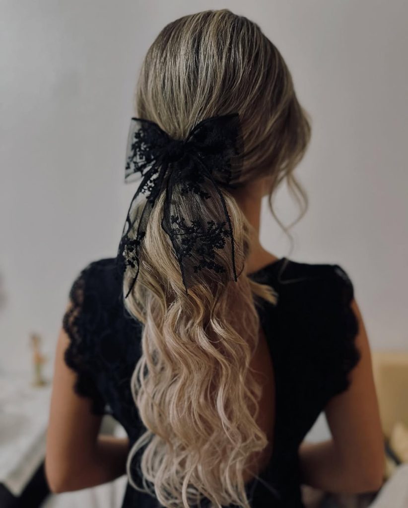 There’s something mysterious yet refined about a black lace bow tied around a low ponytail. The texture of the lace against soft, voluminous curls creates instant glamour. It’s dramatic but wearable—a little bit romantic, a little bit bold, and perfectly on trend for the 2026 aesthetic.