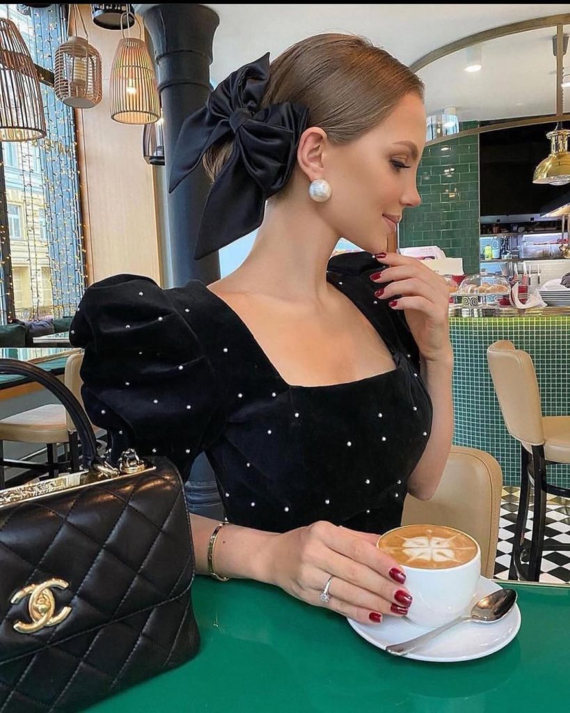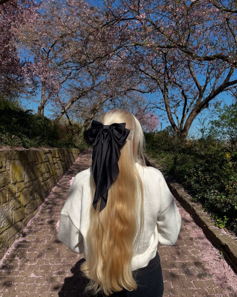 This look feels straight out of a modern fairytale—long, golden hair flowing freely under an oversized black bow. It’s the perfect mix of minimalism and drama, exuding soft coquette charm while staying sophisticated. The contrast of light and dark gives it that effortlessly aesthetic balance that’s perfect for spring walks or outdoor brunches.