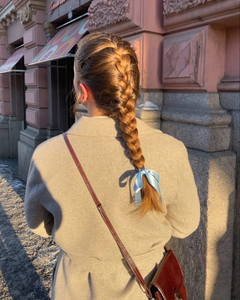 The classic French braid gets a romantic update with a pastel blue bow. It’s practical yet pretty, making it ideal for crisp autumn days or city strolls. The subtle color pop against the braid adds an unexpected touch of sweetness without feeling overdone—the perfect everyday elegance.