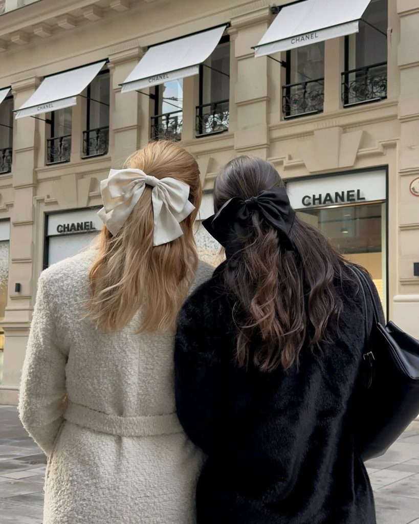 Two friends, two bows—one white, one black. This look is pure Parisian chic. The neutral tones and soft half-up shapes give off elegant, effortless energy. It’s proof that bow hairstyles for women can feel mature and fashion-forward, not just cute. Each bow complements the outfit’s texture and color, blending luxury with ease.