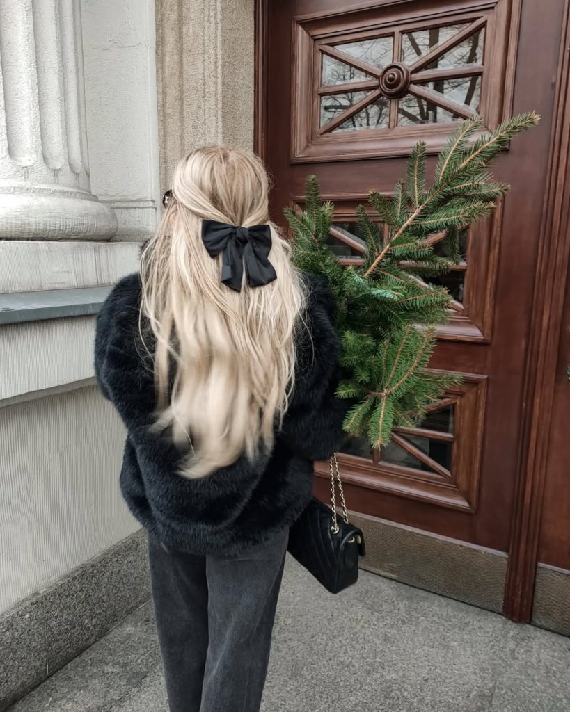 This winter-ready hairstyle feels cozy and sophisticated—long blonde hair styled half up, finished with a soft black bow. It’s the perfect way to bring a touch of warmth and femininity to cold-weather outfits. The relaxed waves and simple ribbon make it ideal for December gatherings or a walk through festive streets.