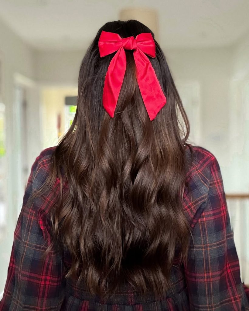 This cheerful red bow transforms a simple half-up hairstyle into a festive statement. The pop of color instantly brightens up dark hair, giving off cozy, holiday-inspired energy. It’s youthful but not childish—a beautiful balance between classic and playful.