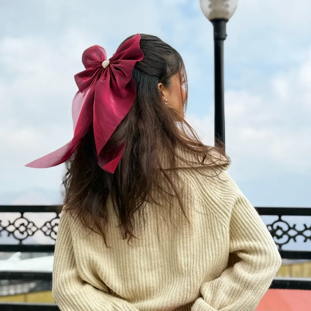 The deep burgundy bow adds a touch of romance to this soft half-up, half-down hairstyle. It’s playful yet grown-up—the kind of look that makes you feel like the main character of a cozy winter afternoon. The rich color pairs beautifully with long hair, adding warmth and dimension against natural tones. This look has a relaxed, coquette aesthetic that feels both nostalgic and refreshingly modern.