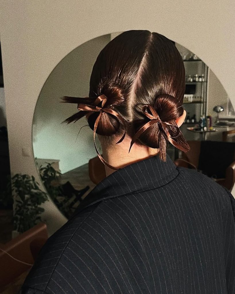 For the trendsetters, double slicked-back buns tied with slim ribbons are the perfect mix of edgy and adorable. The symmetry and sleek finish make it look intentional and fashion-forward—a daring twist on the classic coquette trend. It gives off that confident “I do what I want” vibe, all while keeping things minimalist and aesthetic.