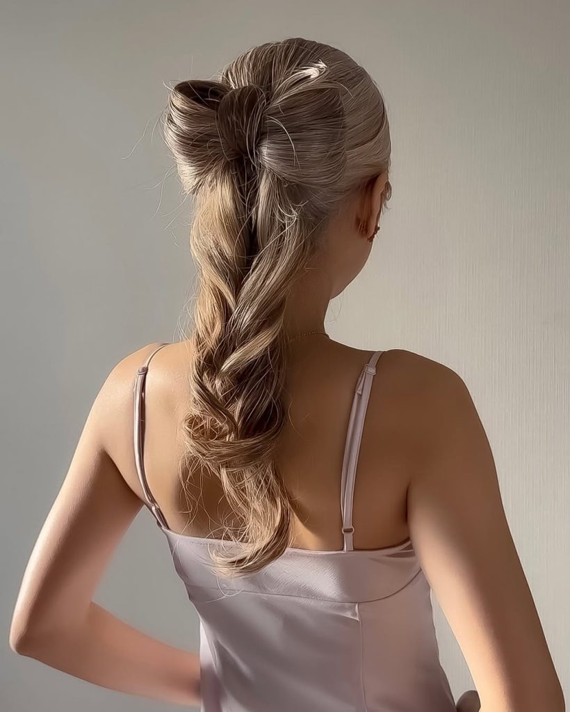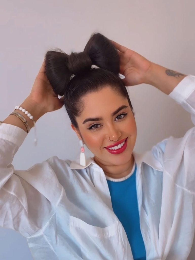 Best for long hair or straight hair with natural shine, this look requires patience and a touch of precision. Start with a slicked-back base and use clear elastics to form the bow shape, then let the ends cascade freely. It’s a stunning option for women who love bow hairstyles for women but prefer something more sculptural than accessorized.