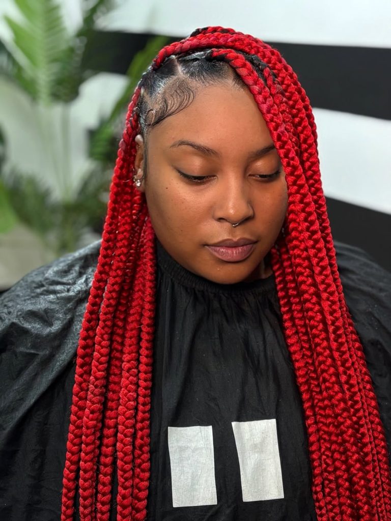 There’s nothing that turns heads quicker than big fiery red box braids. The very color is sufficient to make a statement, while the volume sections give the look an unstoppable, striking feel. It’s a look that oozes the attitude that says, ‘I’m not scared to command space and unleash my goddess within.