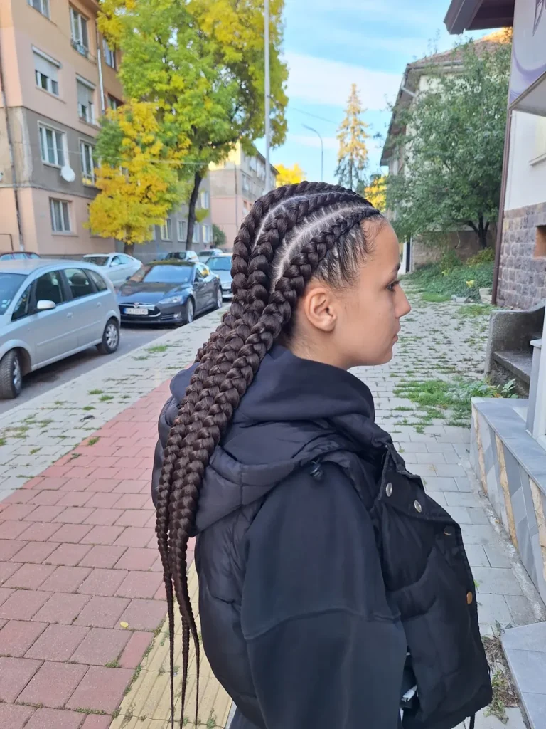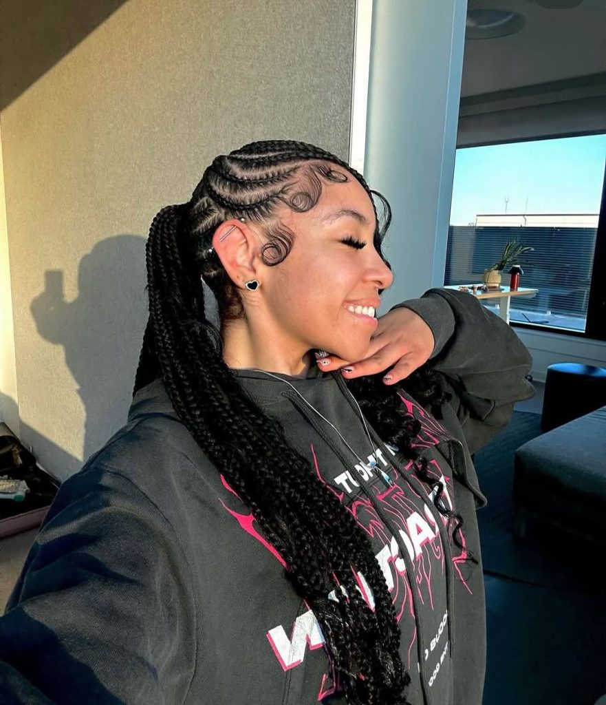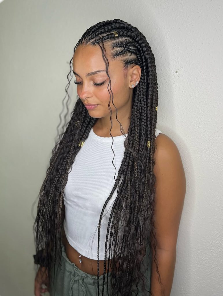 This look combines tidy cornrows with long, luscious box braids, producing an appearance that’s both sleek and vibrant. The edges braided in fine swirls add that adorable finishing touch, keeping it young and fashionable.