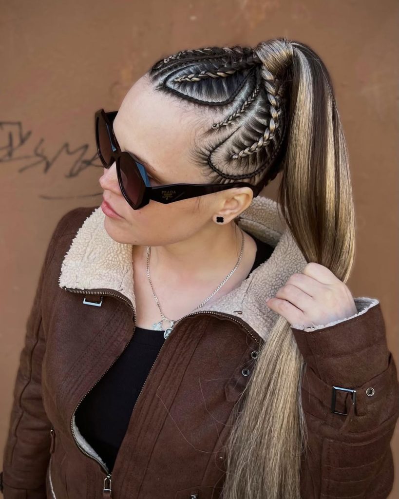 Romantic and whimsical, the look elevates braiding expertise to the next level with the heart design at the temple. Coupled with blonde braids and wavy loose strands, it feels playful and airy. It is the type of hairstyle that gets people started in conversations.