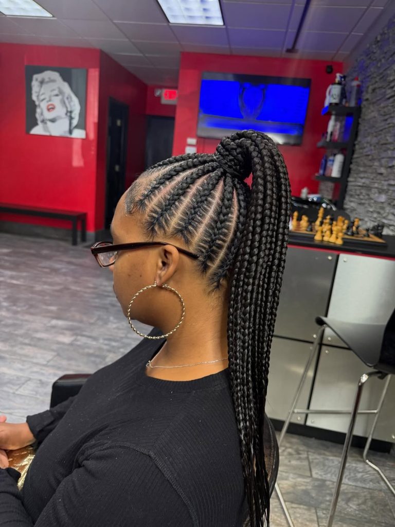 This hairstyle is a mix of sleek glamour and urban edge. The feed-in braids draw the eye upward into a high ponytail, giving the whole look a lifted, polished feel. It’s the kind of braid design that feels both simple and artistic, and the contrast of tight braids against flowing lengths adds drama without trying too hard.