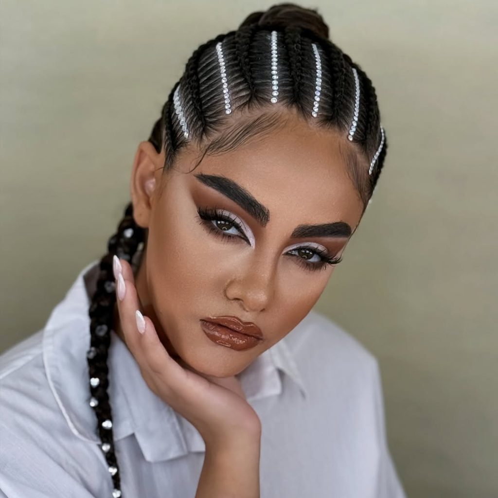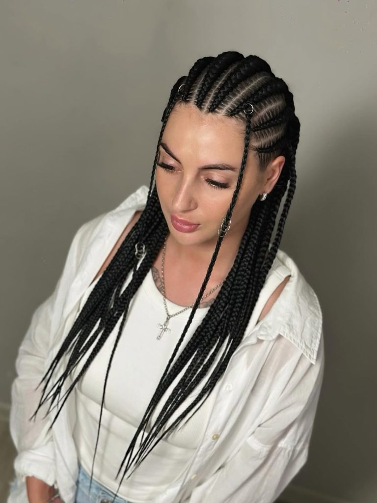 For women who love a touch of glam, these cornrows with beaded accents are a dream come true. The beads catch the light, giving the braids a sparkling, eye-catching finish. Combined with sleek makeup, this look feels fierce and unapologetically stylish.