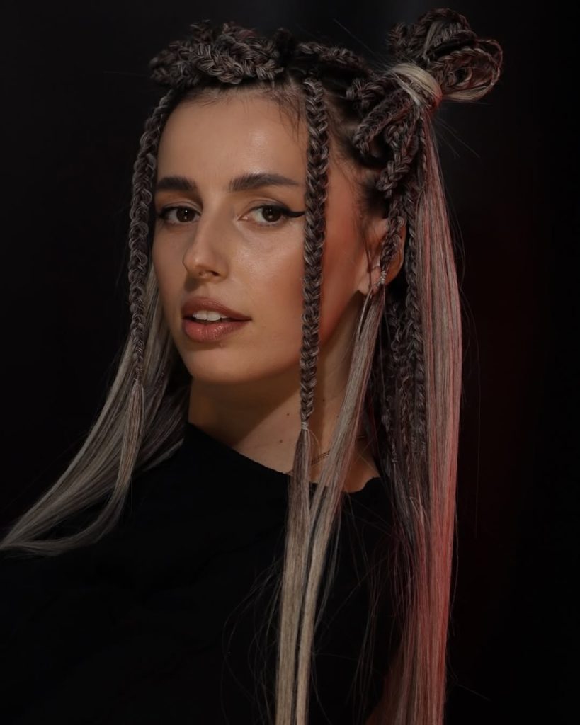 These long aqua and silver box braids turned into space buns look new, futuristic, and simply fun. These are great for the women who enjoy a dramatic look that combines cute details and whimsy. The very color combination creates the illusion that it’s the statement hairstyle.