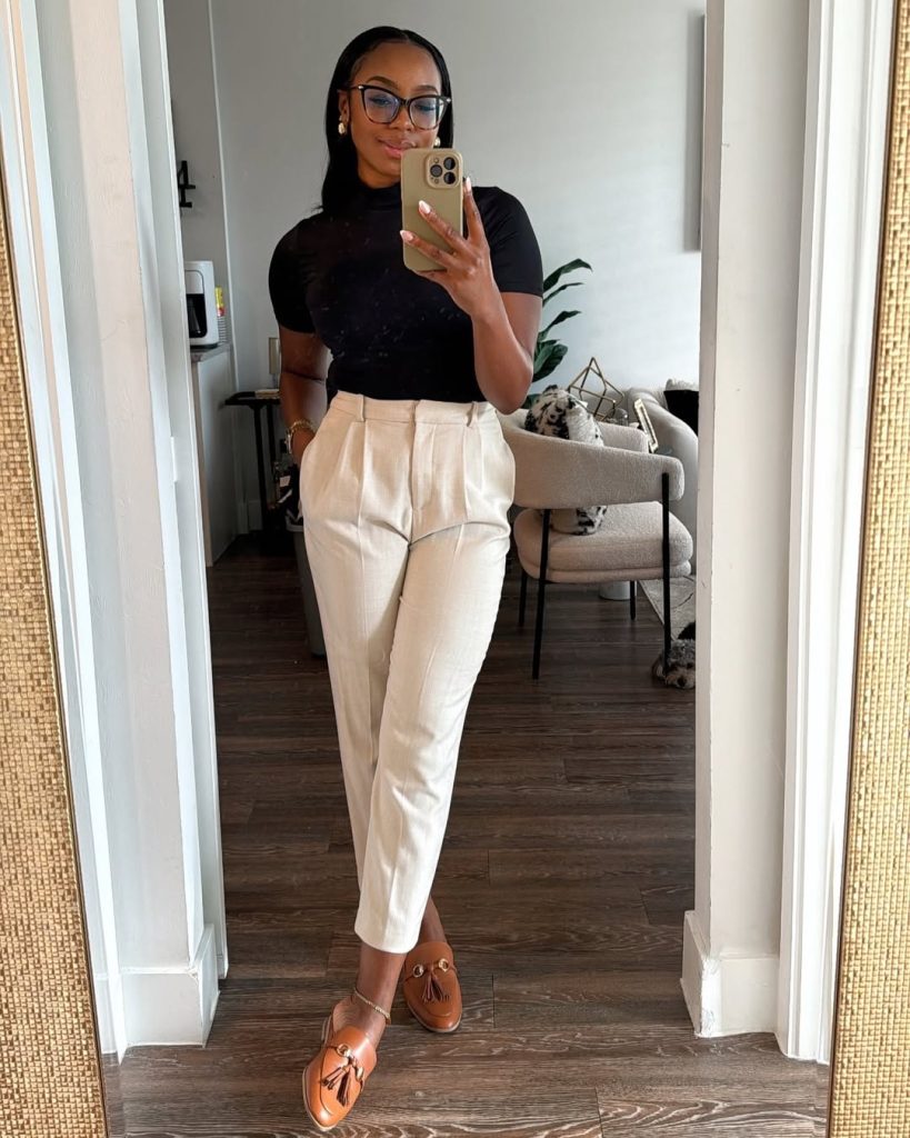 A clean, simple take on office polish—tailored cream trousers paired with a fitted black top for an effortless, comfy balance.