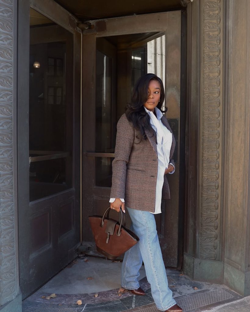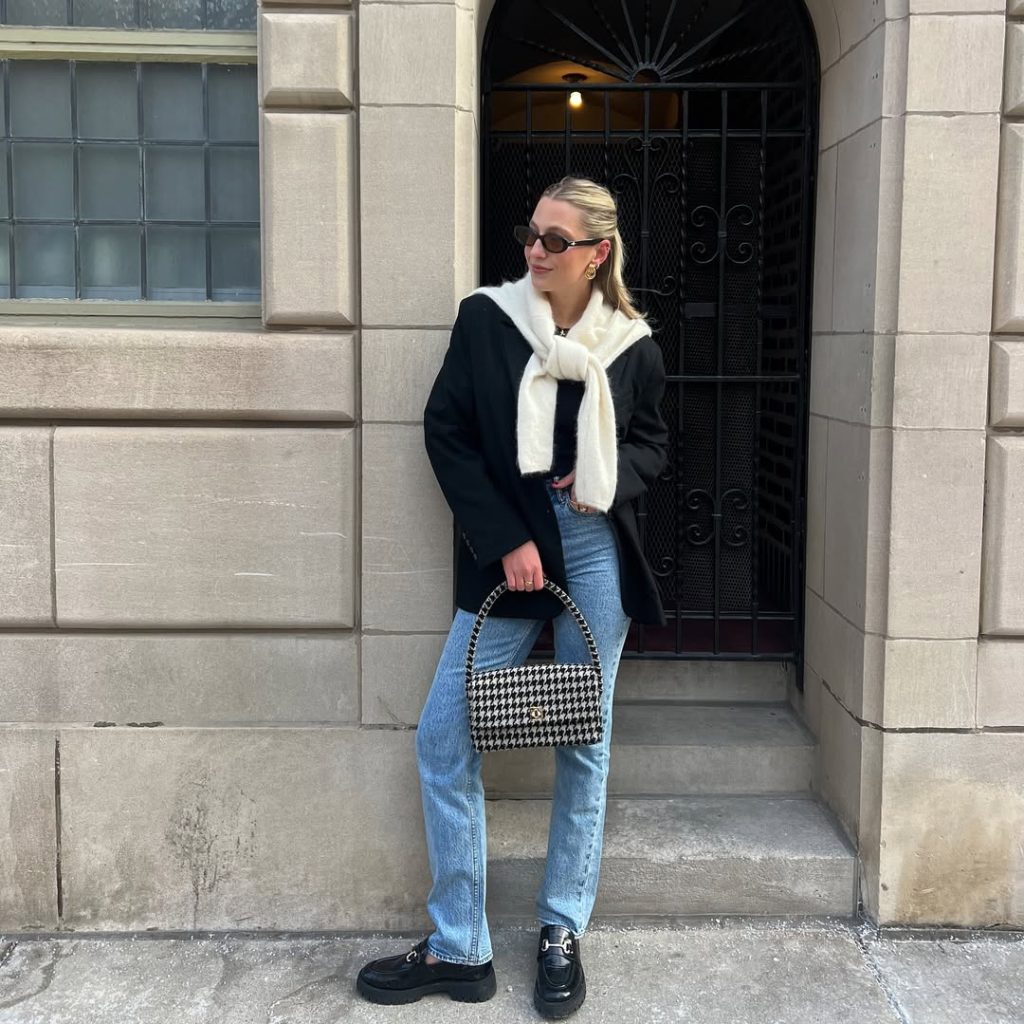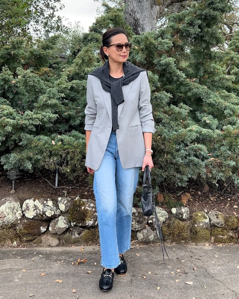 A timeless cool-weather pairing—oversized blazer, soft sweater draped over the shoulders, and straight women’s jeans for relaxed sophistication.