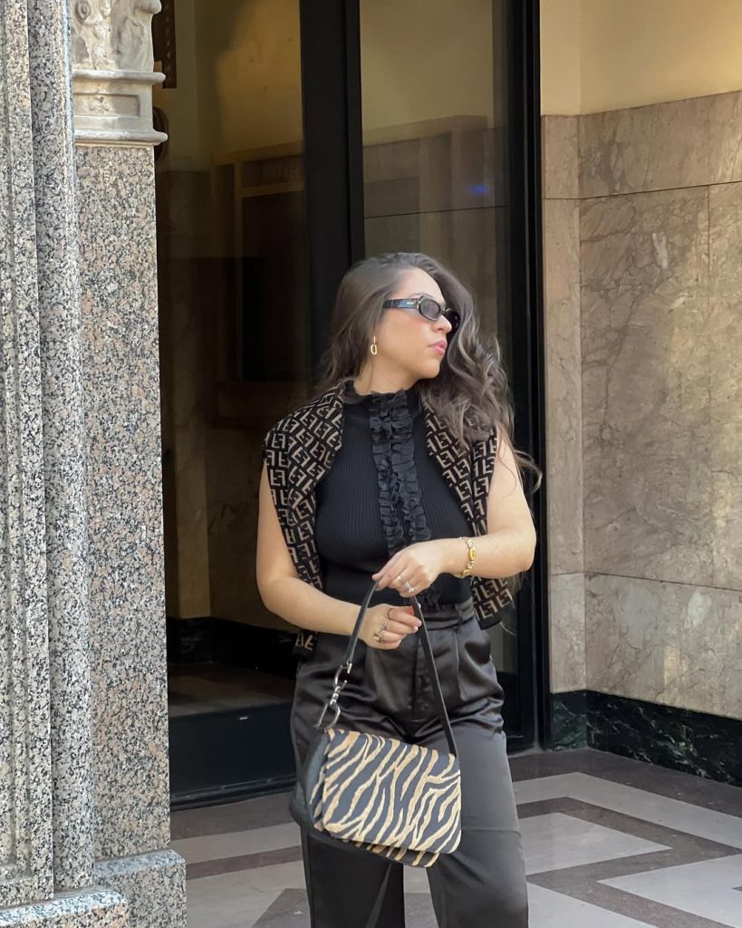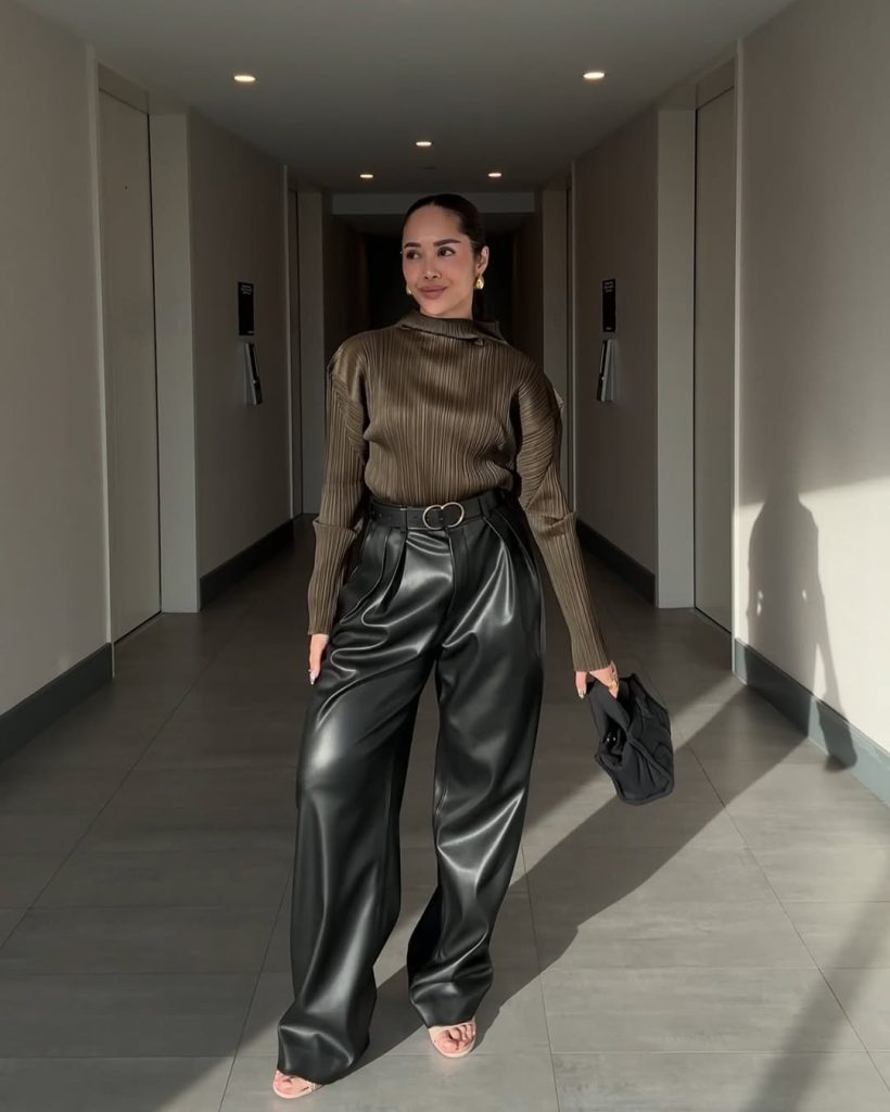 This outfit is a masterclass in mixing textures—silky trousers paired with a structured top and patterned bag. It works perfectly for women’s winter evenings, downtown office settings, or after-hours networking events. Add pointed-toe heels for sharpness, or soften the look with neutral mules. Avoid clashing prints; the zebra bag is the star accessory here.