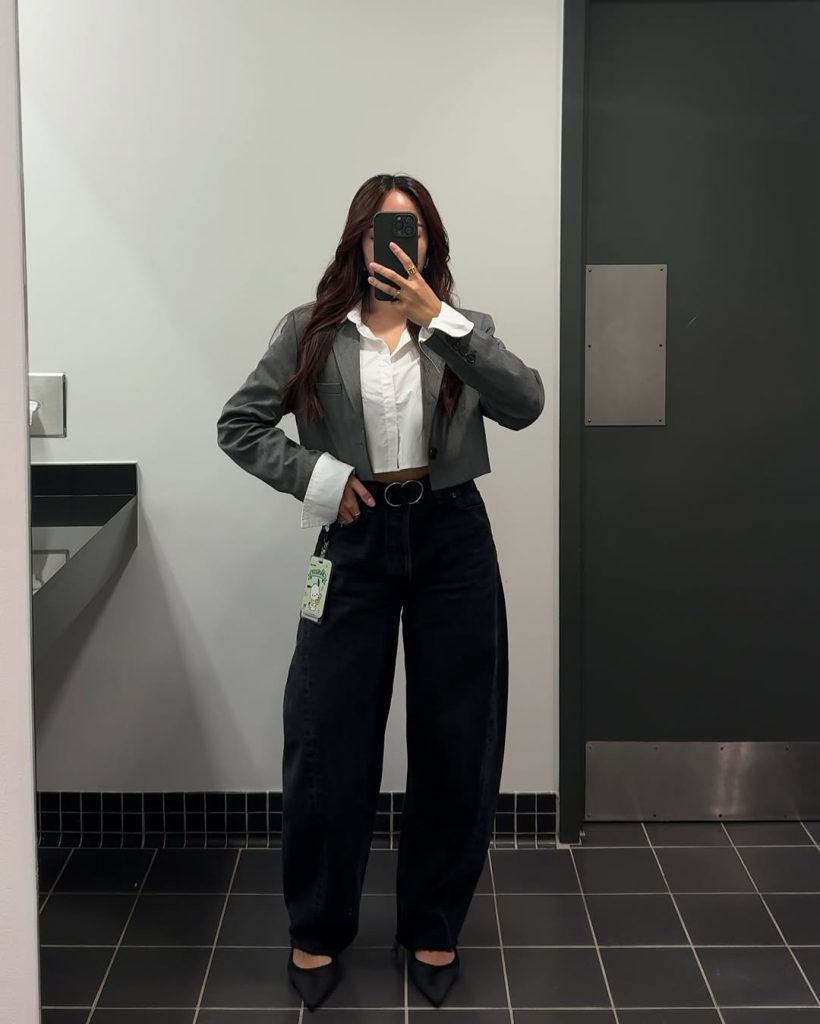 This is the kind of outfit that suits women who enjoy a little edge in their work wardrobe—perfect for tech offices or creative teams where clean tailoring meets comfort. Works great for women in fall and winter, especially with a longer coat layered over. Add a sleek tote or structured crossbody to refine the silhouette. Avoid chunky sneakers here; pointed heels keep the proportions balanced. It’s a confident, slightly funky take on classic business attire.