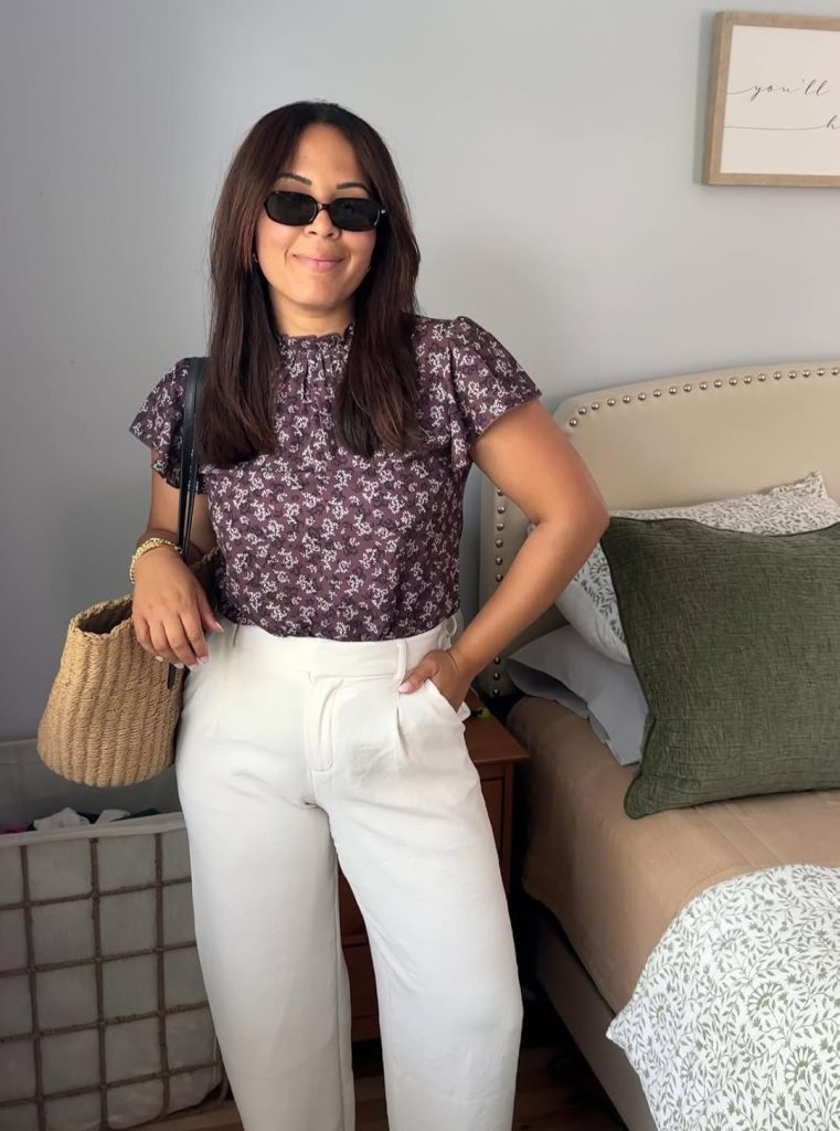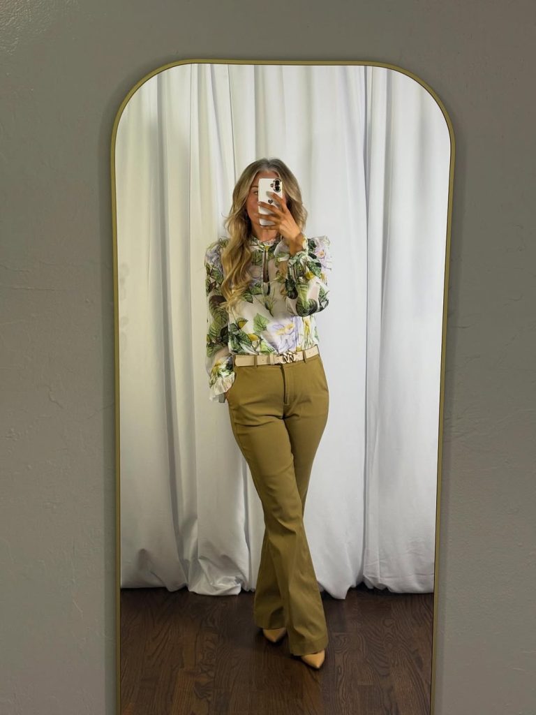 A soft, polished combination featuring a floral blouse tucked into camel trousers—feminine, graceful, and beautifully women’s spring appropriate.