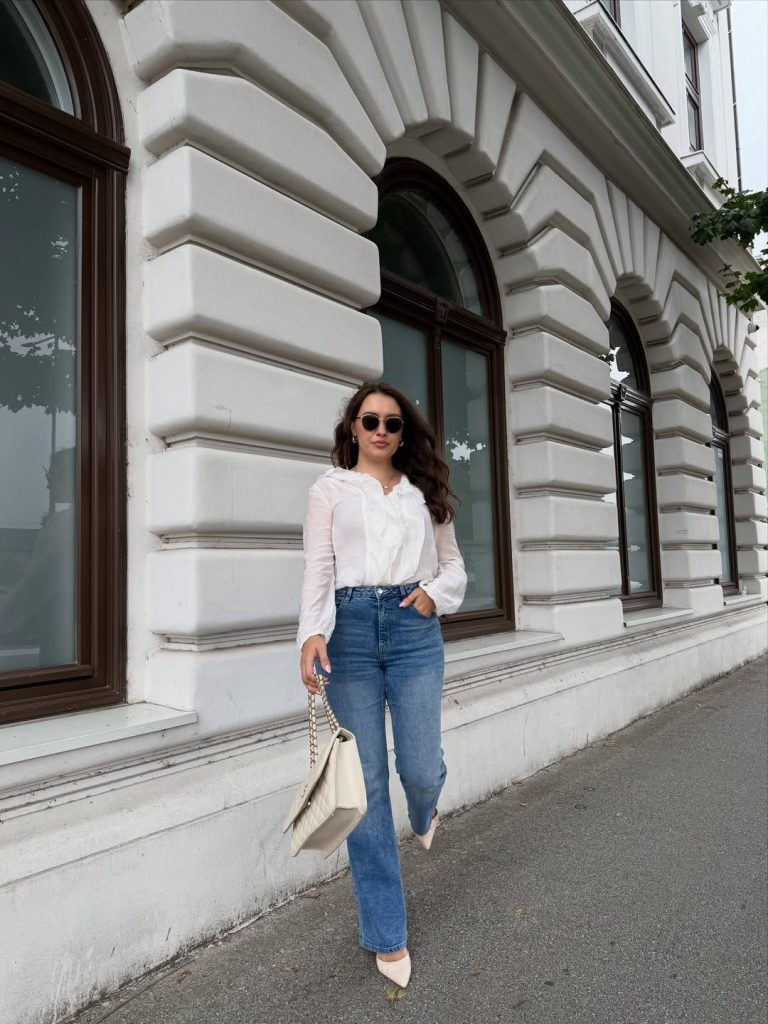 An elegant pairing of a romantic white blouse and classic straight-cut women’s jeans, blending simplicity with soft European charm.