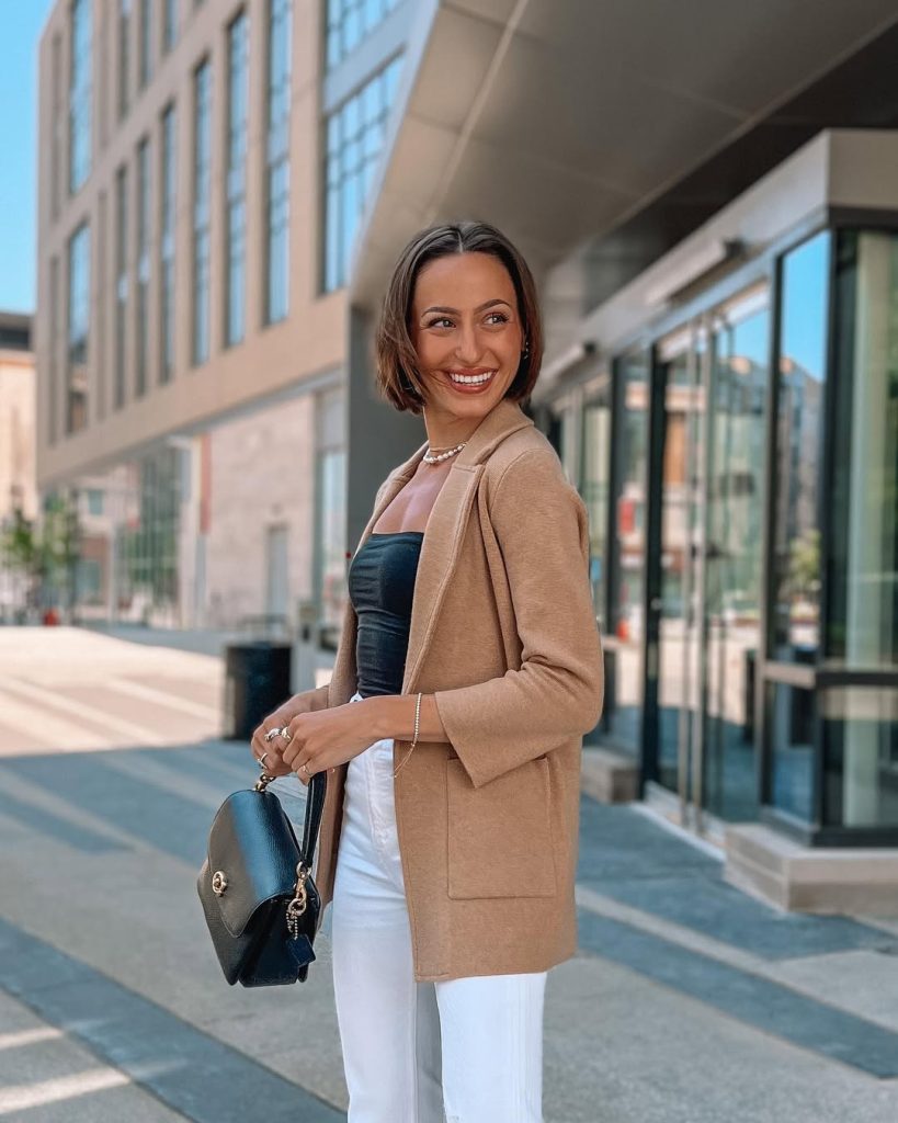 A polished neutral pairing—a camel blazer, white pants, and a sleek black top for an elegant women’s work look.
