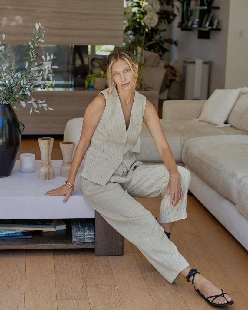 A soft, tailored three-piece vibe—a sleeveless vest and relaxed trousers in pinstripe for a minimalist, comfy business aesthetic.