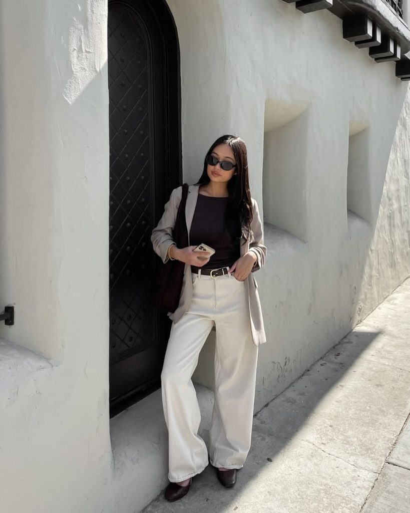 An understated mix of earthy tones—a taupe blazer layered over a dark top with wide-leg cream denim for modern women’s fall style.