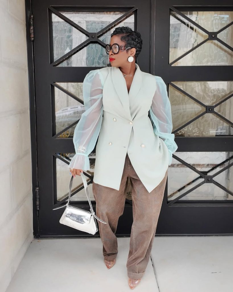 A bold, fashion-forward combination—a mint double-breasted blazer with sheer sleeves and textured trousers for standout women’s style.