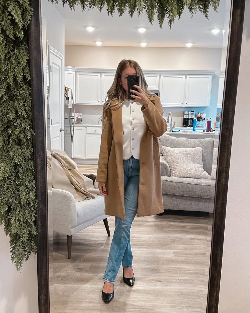 A timeless pairing—a camel coat layered over a sculpted white top and straight women’s jeans for relaxed elegance.
