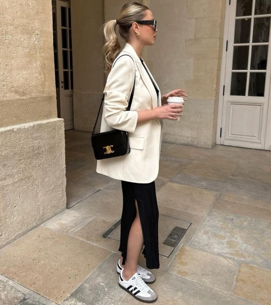 A chic blend of sporty and polished—a white blazer, black skirt, and sneakers for a modern, city-friendly business casual look.