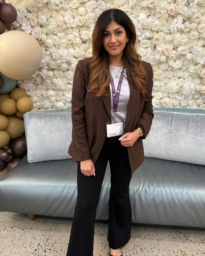 Brown has made a huge comeback in women’s work fashion, and 2026 is strengthening that trend. A deep chocolate blazer worn over a soft gray tee and paired with black trousers offers understated confidence with a warm, grounded mood.