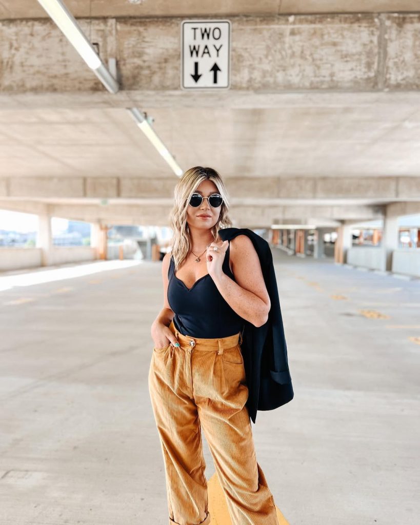 A bold take on business casual, mixing slouchy golden wide-leg pants with a sleek black top and blazer casually tossed over the shoulder. It’s a confident, modern look that fits the more creative side of work culture in 2026.