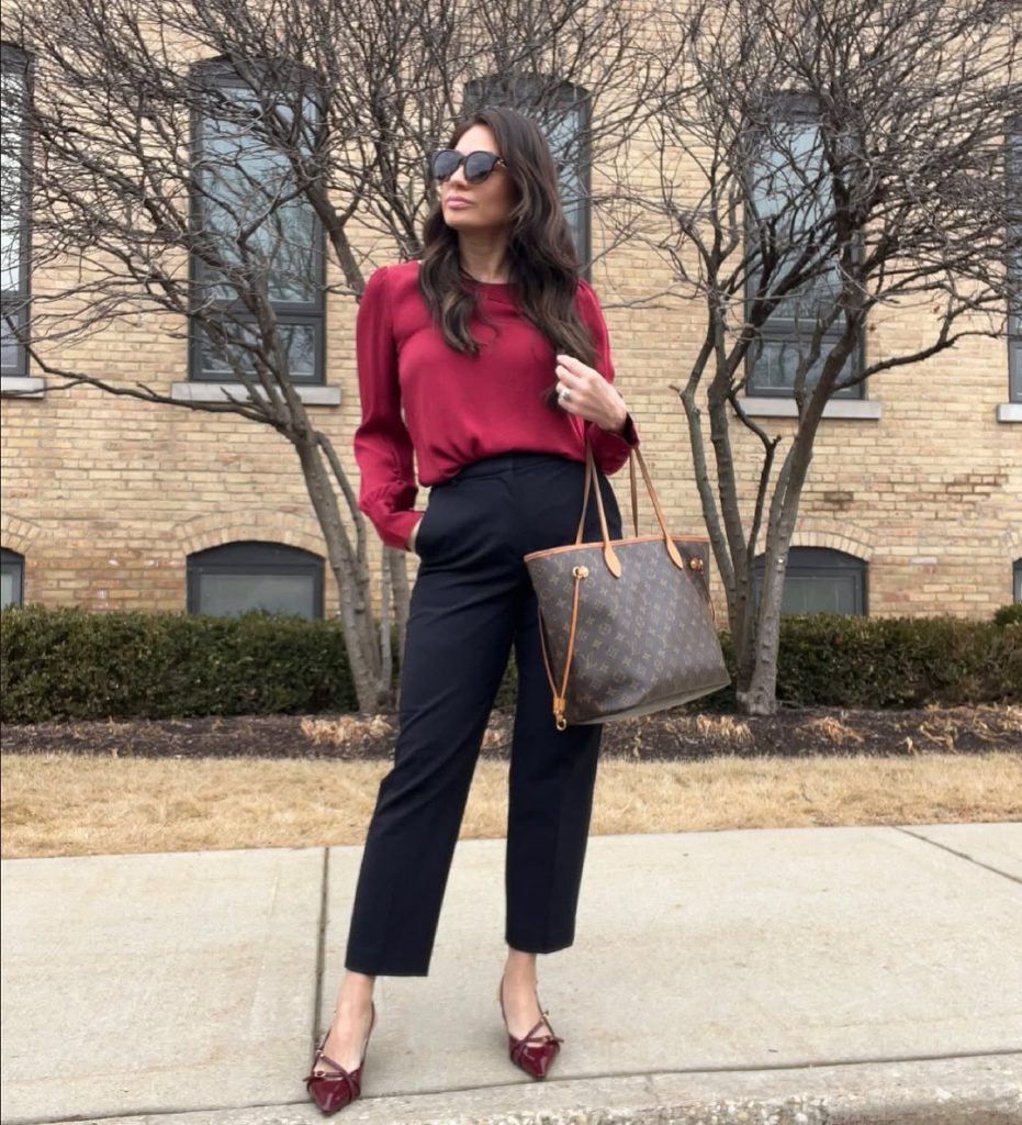 A rich burgundy blouse paired with black tailored trousers creates a timeless silhouette that’s both powerful and approachable—an outfit that many women work professionals rely on.