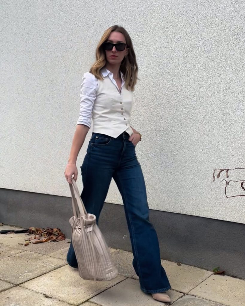 Nothing says modern business casual like a crisp white shirt paired with a tailored vest and dark denim—a nod to menswear styling adapted for women who want both edge and elegance.