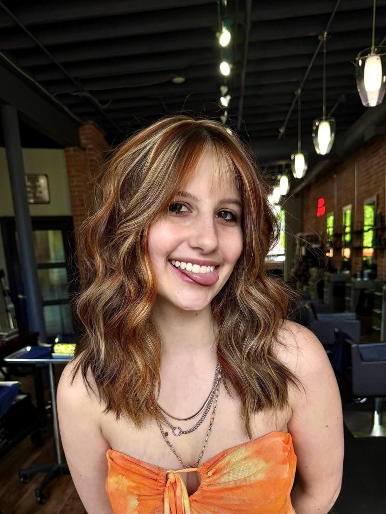 This cut feels relaxed and effortlessly stylish — a modern shag enhanced with blonde, copper, and black tones. The soft fringe keeps it playful, while the waves add a lived-in vibe that feels perfectly on trend for 2026. It’s the definition of hair that looks like it belongs to someone fun and confident.