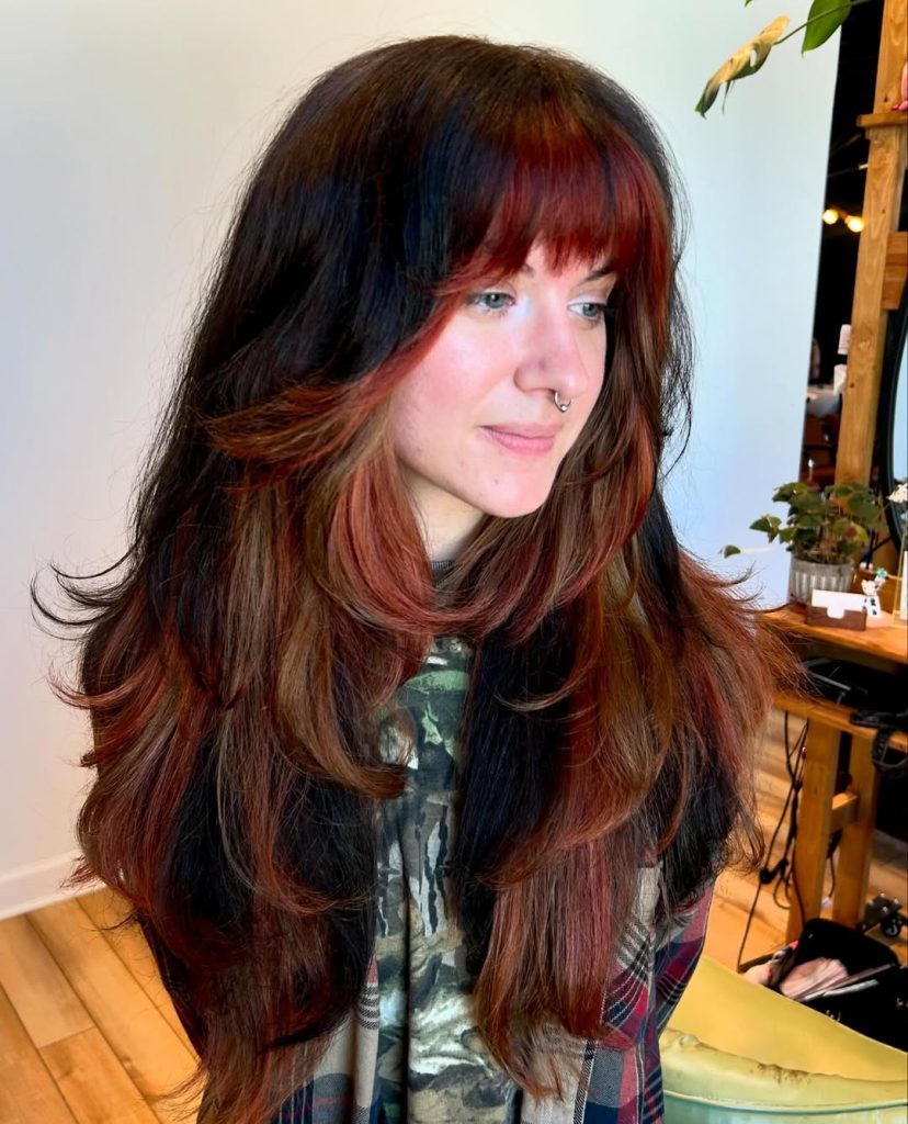 This hairstyle feels like autumn wrapped into one look — deep, dark layers with bold red highlights peeking through. It’s moody yet inviting, the kind of style that says you’re confident but not afraid of a little drama. The feathered ends keep it soft and feminine, while the layered shape gives movement that makes the red color glow even brighter.