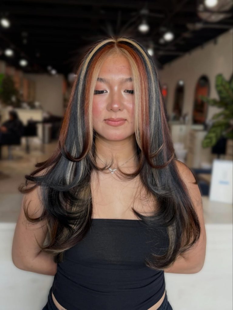 This style is like a kaleidoscope of hair color — golden blonde, soft copper, dark brown, and even blue-black tones blending together in striped layers. It feels bold but refined, like a runway-inspired look that’s still wearable in real life. The way the colors align vertically frames the face beautifully and adds instant brightness to the skin.