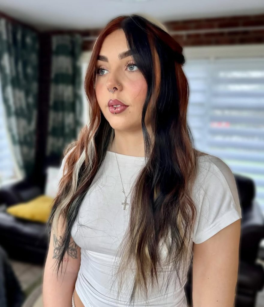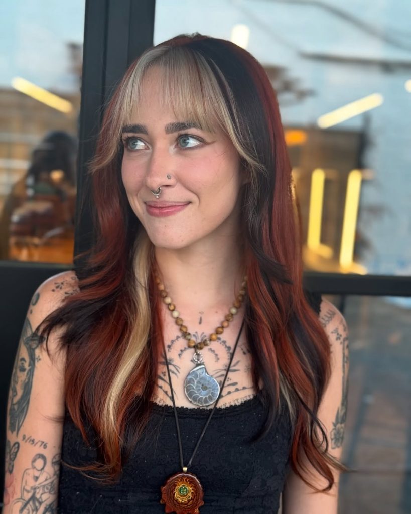 This hairstyle has a little retro energy thanks to the full blonde fringe, but the fiery red and deep black lengths bring it firmly into the modern day. It feels playful and bold, like something you’d wear to spark conversation. The combination of light and dark shades frames the face beautifully and makes the green eyes pop with contrast.